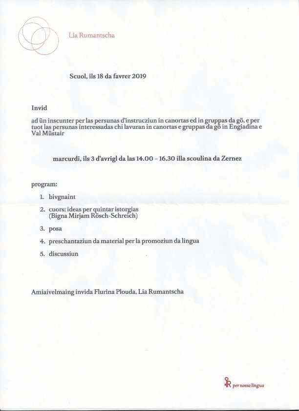 Als erstes Angebot hat uns die Lia Rumauntscha (am 3.4.19) nach Zernez zum romanischen Vers und Liederkurs eingeladen, den Infobrief dafür habt ihr direkt von der Lia erhalten.