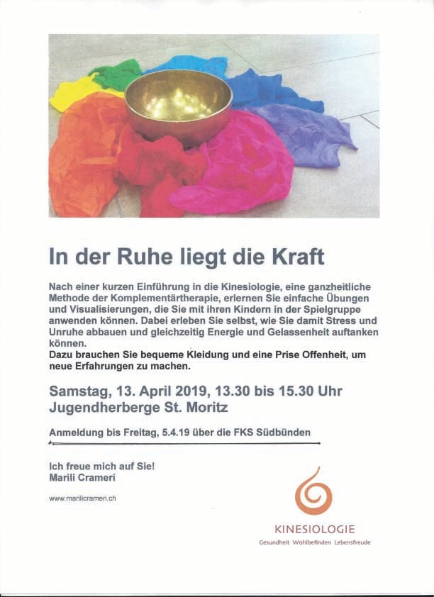 Für den Samstag,13.4.19 von 13.30-15.30 Uhr, in der Jugendherberge St.Moritz, haben wir einen interessanten Kurs, zum Thema: Kinesiologie in der Spielgruppe, organisiert (Flyer dazu liegt bei).